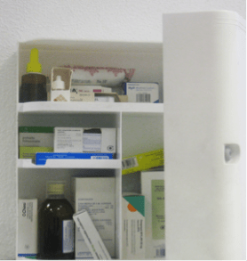 Es conveniente que sólo haya medicamentos para afecciones leves. El botiquín puede contener: analgésicos, antitérmicos, productos para picaduras de insectos, antiinflamatorios y pomadas para las quemaduras.