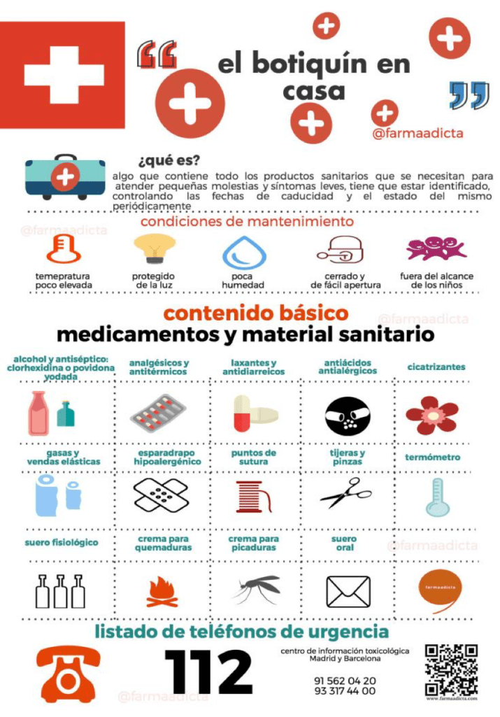Es muy útil tener en el exterior o interior del botiquín o del lugar donde guardemos los medicamentos teléfonos de utilidad en caso de emergencia: centro de salud, directorio médico o ambulancias, Centro Nacional de Toxicología.