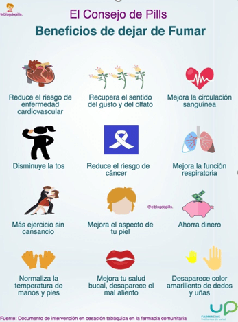 - Busca ayuda. Abandonar el tabaco no es fácil. Son pocas las personas que lo consiguen solas y a la primera, por lo que es recomendable apoyarse en alguien como los profesionales sanitarios son los más indicados para multiplicar por cuatro sus posibilidades de lograrlo. De hecho, el abordaje clínico del consumo de tabaco puede ser determinante a la hora de abandonar ese hábito. Hoy en ciertas farmacias se ofrece un Servicio de Deshabituación Tabáquica tanto farmacológica como psicológica. En Farmacia ULM podemos ayudarte