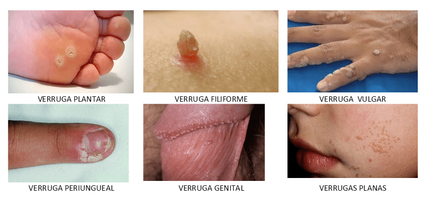 1. Verruga vulgar. Se presentan como excrecencias circunscritas del mismo color de la piel, con superficie córnea y tacto rasposo. Se localizan preferentemente en el dorso de las manos y de los dedos; le siguen en orden de frecuencia: cara, cuello y cuero cabelludo. En algunas localizaciones (párpados, cara y cuello) pueden presentarse como lesiones más pequeñas, blandas y largas (verrugas filiformes). Pueden presentarse como lesiones aisladas o agrupadas en número variable.