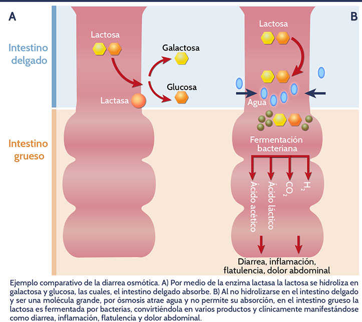 - Osmótica: se produce por la presencia en la luz del intestino delgado de solutos(alimentos) no absorbibles o por defectos en la absorción, lo que incrementa la presión osmótica, la permeabilidad y el paso de agua a la luz intestinal. Se caracteriza por deposiciones acuosas de <1 litro/día y molestias abdominales. Cede con el ayuno y al suspender la ingesta del soluto causante. Es el caso de la diarrea por malabsorción de azúcares de la dieta como lactosa, fructosa y sorbitol (ambos muy utilizados como edulcorante en la industria alimentaria).