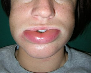 Aproximadamente un 40% de los pacientes con urticaria va a presentar angioedema que afecta a dermis profunda y que se presenta como edema, de márgenes imprecisos y sin eritema. A diferencia de otros edemas que suelen aparecer en zonas declives del cuerpo, en el angioedema se suelen afectar labios, lengua, párpados, genitales y vía aérea superior.