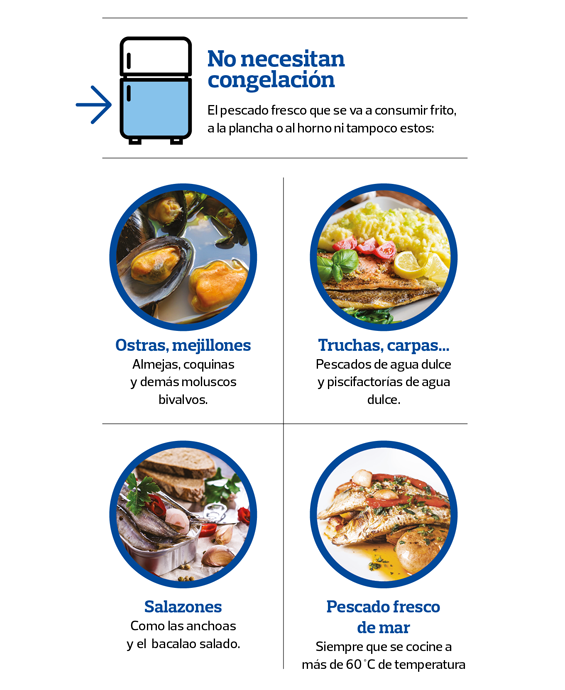 • Congelar a −20º durante al menos 24 h, preferentemente 5 días, recomendándose el pescado ultracongelado porque se eviscera precozmente en alta mar y la probabilidad de parasitación es menor.
