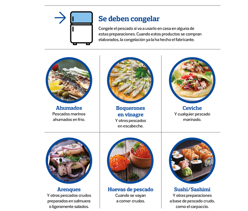 - Conocer el riesgo que se asocia a algunas preparaciones como salazones, ahumados, encurtidos, marinados, Carpacho o ceviche, y exigir que se preparen con pescado congelado previamente. Estos tratamientos culinarios no son suficientes para provocar la inactivación de las larvas.