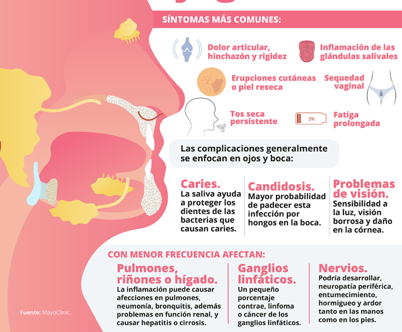 Se caracteriza por sequedad bucal, de ojos y de otras mucosas debido a una infiltración linfocítica de las glándulas exocrinas y a disfunción glandular secundaria. El síndrome de Sjögren puede afectar a diversas glándulas exocrinas o a otros órganos.
