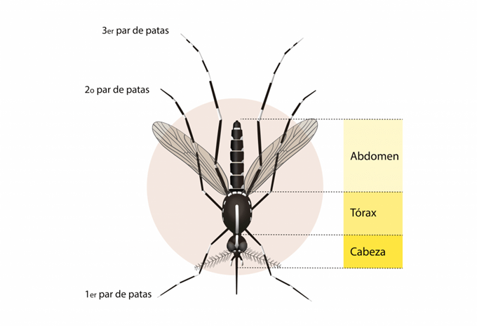 El cuerpo de los mosquitos se divide en tres partes: cabeza, tórax y abdomen. En la cabeza encontramos un par de antenas, un par de ojos compuestos y las piezas bucales modificadas en estiletes para penetrar en tejidos sólidos y aspirar alimentos líquidos. El tórax tiene seis patas y un par de alas